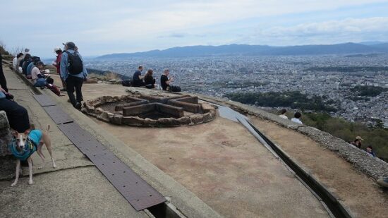 大文字山火床。中央のゴツゴツしたのが「火床(聖火台)」です。毎年8月16日の「五山の送り火」でこの様な火床が75個、大の字形に置かれていて点灯される。眼下には京都市街が。