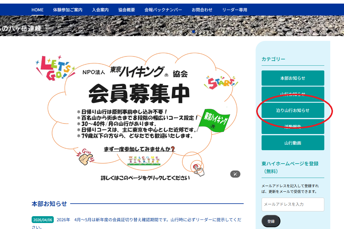 ホームページ右サイドバーの「カテゴリー」欄にある「泊り山行のお知らせ」をクリックすると、ご覧いただけます。(下記の図を参照ください。)