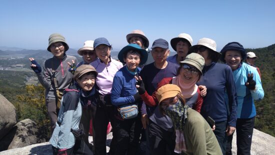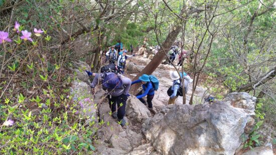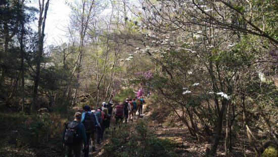 三上山・金勝アルプスは共に巨岩奇岩の連なりと素晴らしい眺望の縦走路が続き、低山とは思えない変化に富んだ山です。眼下には琵琶湖、歴史感、滝、岩登り、シダの繁茂も珍しく、オマケに今回はコバノミツバツツジが満開!みごとな天空のパノラマルートを歩けて大満足です。歩く距離を考えれば、何通りにも楽しめそう。良いお山でした。いろんなご協力に感謝です、全員おつかれさま!