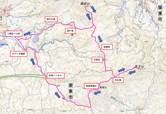 11日:JR野洲駅=草津駅 滋賀バス=上桐生バス停8:45→落ケ滝9:20→鶏冠山10:37→天狗岩11:30/12:15・昼食12:15/12:45→竜王山13:25→上桐生バス停15:30=草津駅=野洲駅・宿