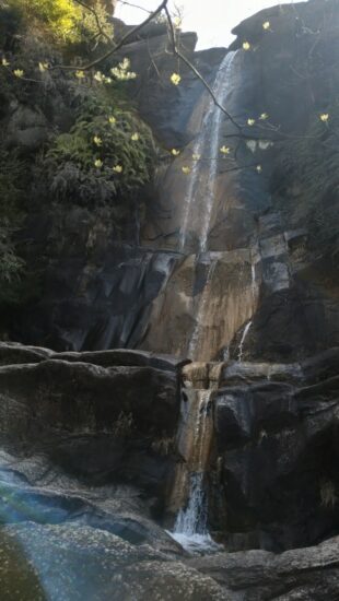 樹林帯の沢に沿って進むと落ケ滝に着きました。黄色い綺麗な花が咲いています。
