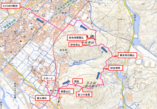12日:野洲駅南口滋賀バス=御上神社下車→表登山道口9:32→岩山展望台10:28→三上山10:35→11:35/12:00昼食→妙光寺山12:52→ゲート→宿14:00=野洲駅=JR米原駅
