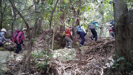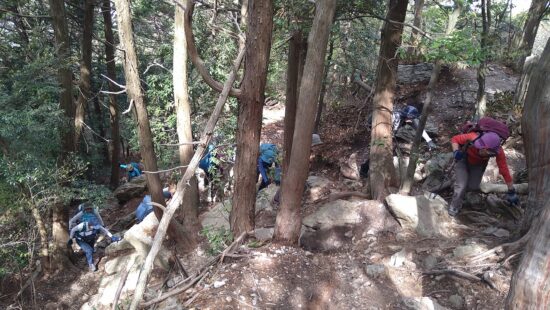 落ケ滝ー鶏冠山分岐でザックを置いて、深い樹林帯の急登を登って行きます。