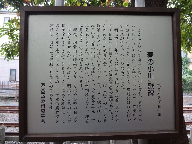 コース:原宿駅9:30→代々木公園9:35→春の小川の歌碑9:52→代々木八幡神社10:01→小田急線代々木上原→東亰ジャーミイ10:38→井の頭海道の碑11:17→大宮八幡宮12:03→善福寺川緑地12:14→JR中央線阿佐ヶ谷駅13:50解散予定歩程9k実働3時間