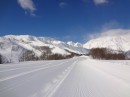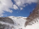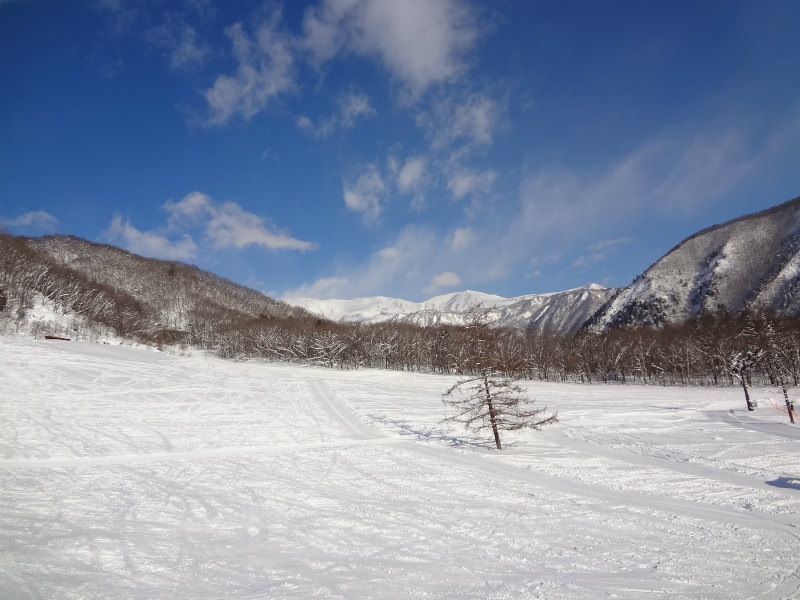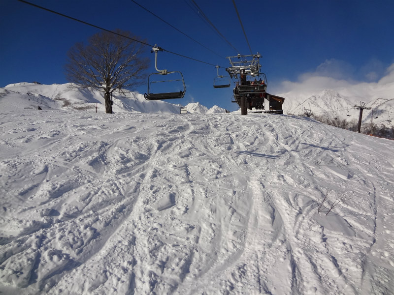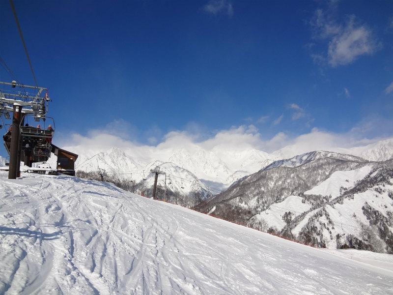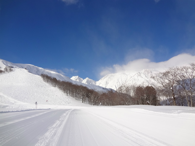 ゲレンデ、スカイラインコース足跡は自分の分だけ裏に唐松岳、不帰の嶮、天狗の頭,白馬三山(白馬鑓ヶ岳.杓子岳.