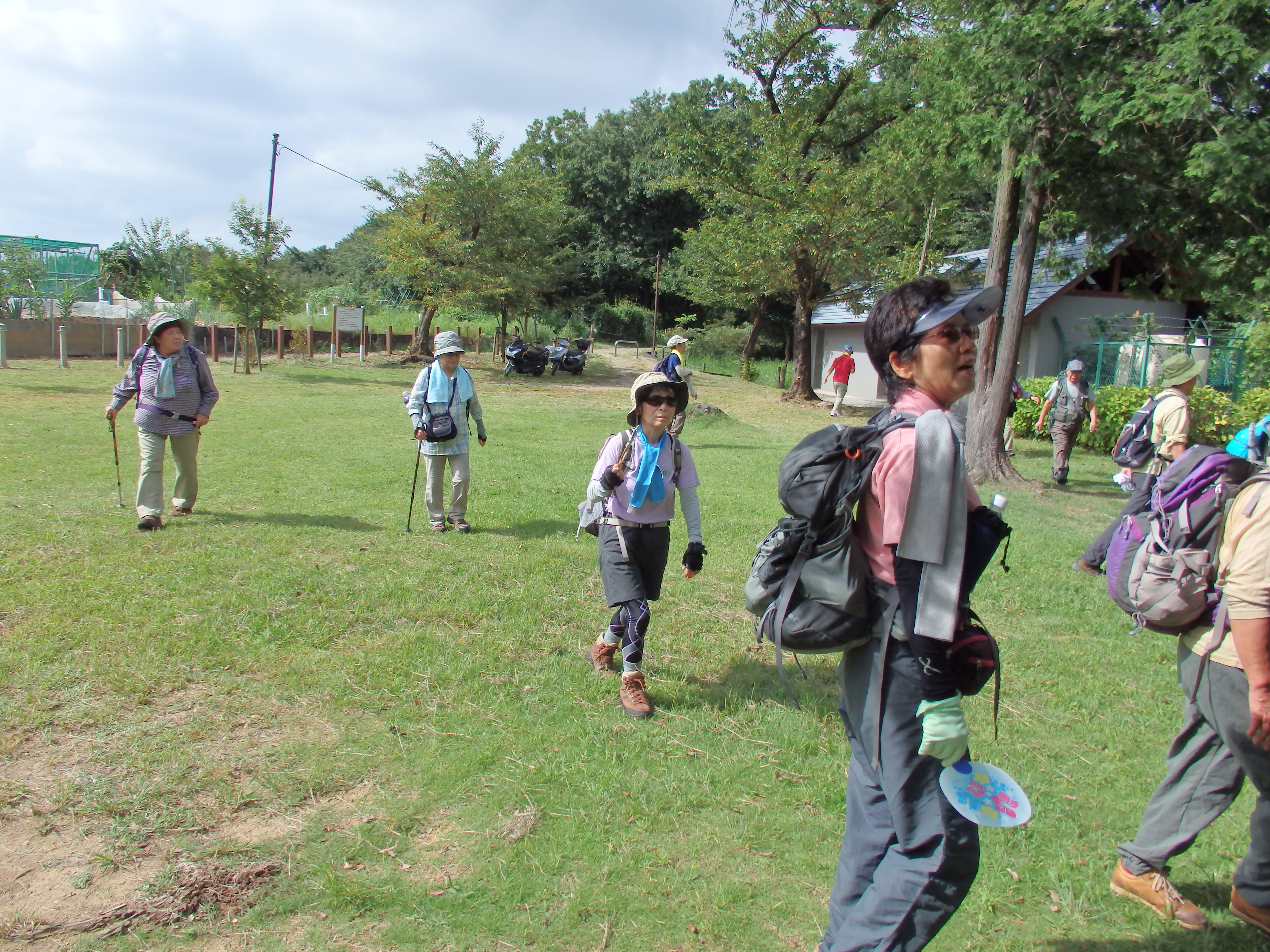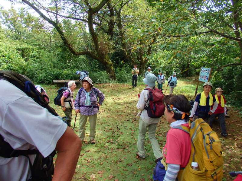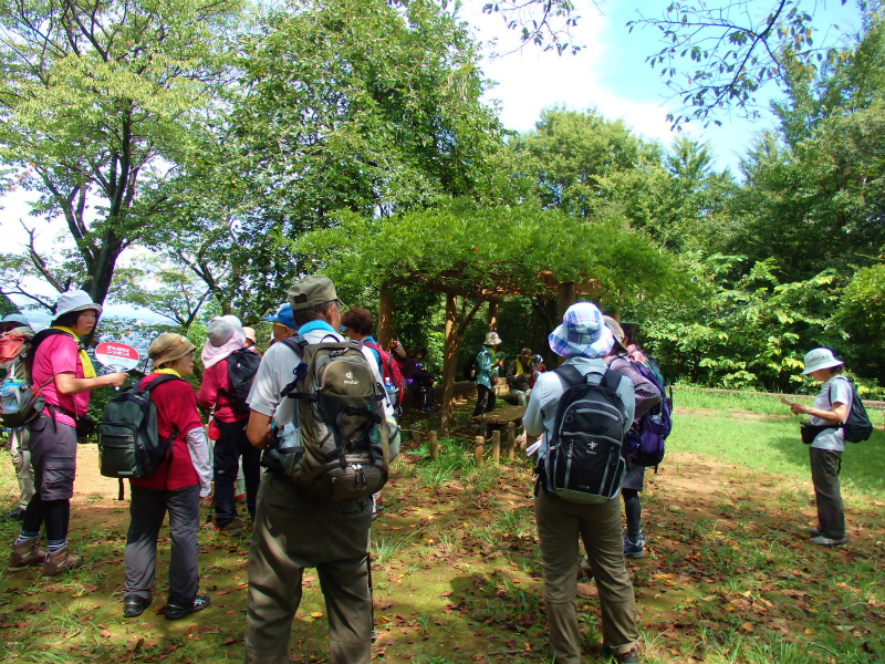 9月に入り11号台風の影響で、北海道、岩手が集中豪雨で被害を受けましたが、この日天気予報は雨50%でした。予報に反し、曇から晴で35名が集合しました。 八王子市、日野、多摩市、稲城市の四市を連ねる東京の西部多摩丘陵です。周辺地域は開発、住宅団地の進出などにより 以前は繋がっている道があったようですが今は寸断され、東京薬科大学の構内を届け出(20人以上の場合)し入らせていただきました。