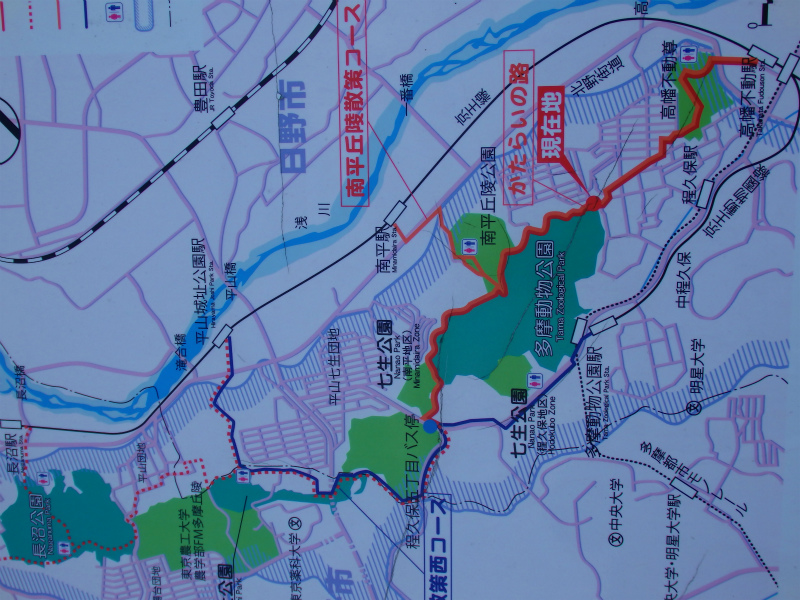 跡地半周ー交差点左へ100m(程久保五丁目バス停)–多摩動物公園外縁ハイキングコース(かたらい