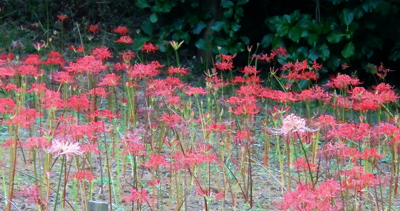 不動尊内の咲き誇る曼珠沙華の群落がきれいでした。高幡不動休憩所館内での冷たいお茶、熱いお茶などいただき、満ち足りた気持ちで解散しました。