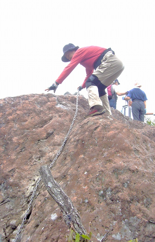 その上に棒が立つ山頂岩があります さらに鎖で登り あまりに狭く 交代でないと登れない。
