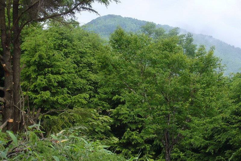ブナと白樺と取り合わせの風景だが、下草類や潅木が多く、雨では写真にならない。