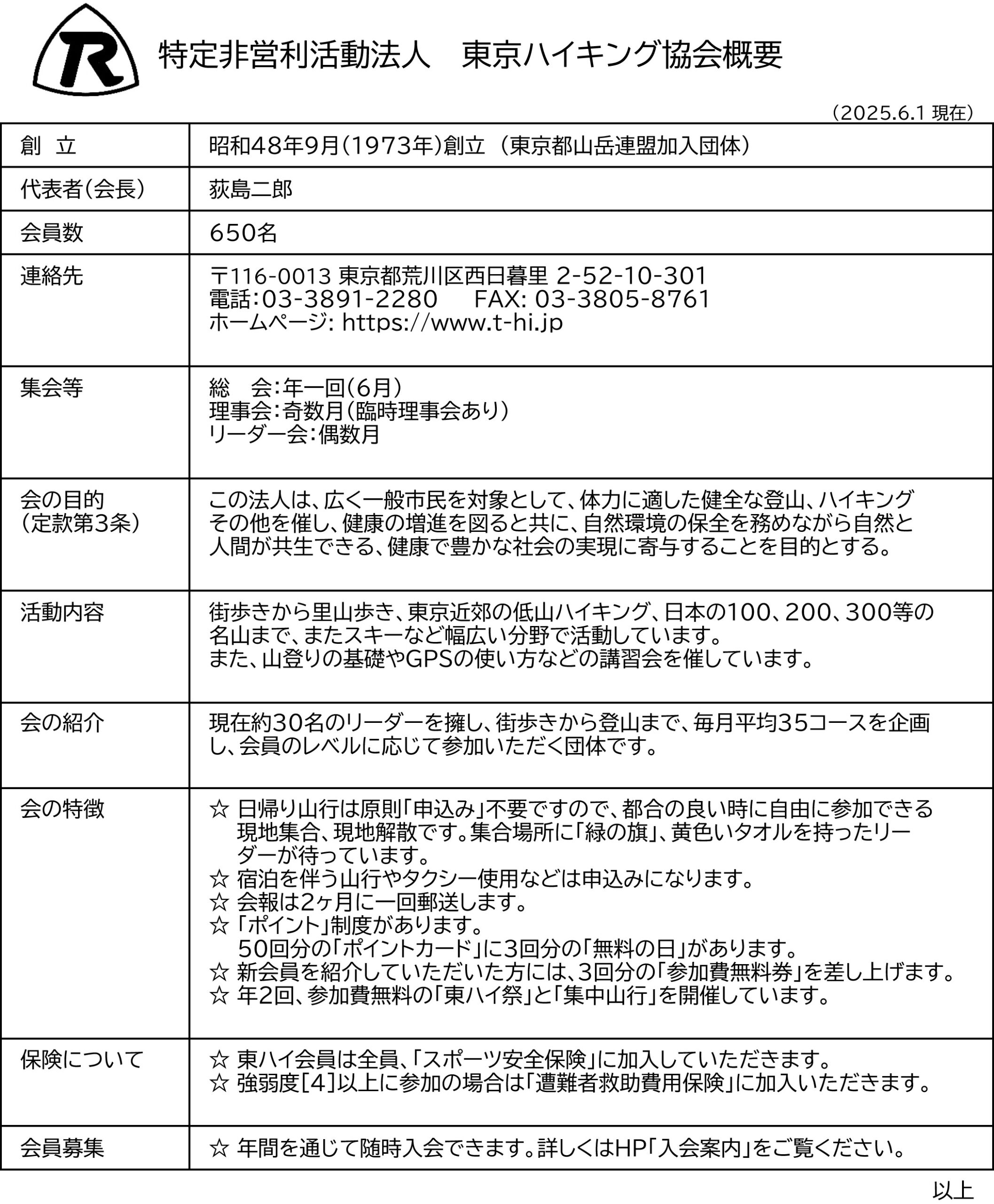 更に、東ハイ祭や集中山行など、会員一同が会することができる行事に重点的に力を注ぎ、末永く皆様と共に歩んで行く、東ハイを目指して参りたいと思います。